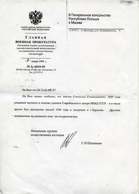 Jeniec obozu NKWD w Starobielsku, zamordowany w siedzibie charkowskiego Zarządu NKWD i pochowany w Charkowie.