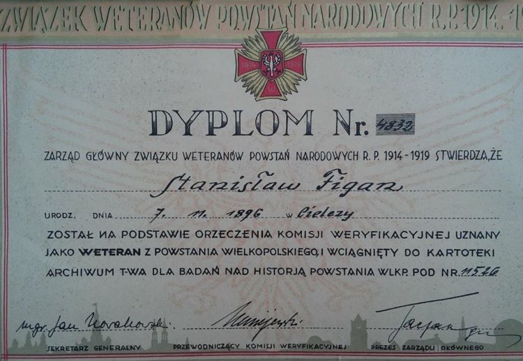 Dyplom potwierdzający udział Stanisława Figana w Powstaniu Wielkopolskim.
