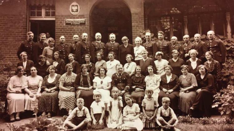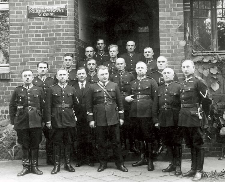Policjanci Komendy Powiatowej Policji Państwowej w Kępnie przed budynkiem komendy przy ul. Ogrodowej 1. Na zdjęciu stoją m.in.: pierwszy rząd od prawej: Wojciech Stefaniak, Marcin Fajfer, Karol Gendaszek (trzeci z lewej), Kazimierz Niewiarowski (komendant). Lata 1932/1937.