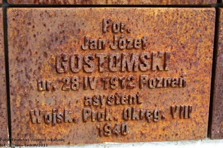 Tabliczka pamiątkowa podporucznika Jana Gostomskiego na Cmentarzu Wojennym w Katyniu.