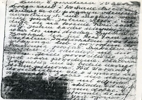 Donoszę, że z przyczyn ode mnie niezależnych nie mogłem wcześniej pisać. Jestem zdrów i znajduję się na terenie Rosji sowieckiej. Jestem bardzo niespokojny o wasz los, moi drodzy. Byłem w Boczkach, lecz już was tam nie zastałem. Zamierzałem was tam zatrzymać lub z powrotem do Poznania posłać. Szukałem was wszędzie, lecz odnaleźć nie mogłem. Jeżeli powróciliście, jakie jest wasze powodzenie? Władzia przyrzekła mi, że będzie naszego domu pilnować. Pod Warszawą dowiedziałem się o śmierci naszej matki. O sobie nic na razie (…). Proszę mi odpisać. (…) składu od wuja ja (…) mu dobrze. I (…). Do miłego (…).