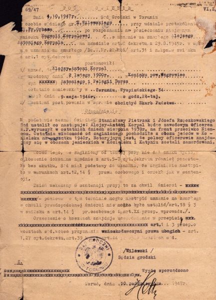Sąd Grodzki w Toruniu na wniosek małżonki Eugenii Korpal postanowił uznać, że Alojzy-Antoni Korpal urodzony 2 lutego 1900 roku w Koninku, pow. Wągrowiec syn Antoniego i Pelagii Dorsz zmarł dnia 9 maja 1946 roku o godzinie 24-tej.