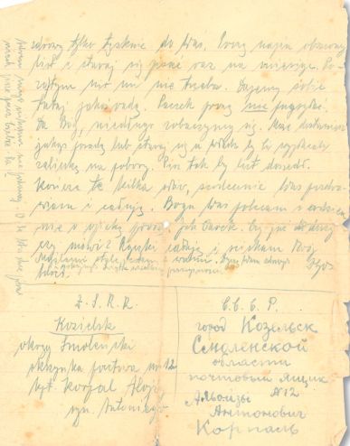(Z.S.R.R. Kozielsk, okręg smoleński, skrzynka pocztowa nr 12, kpt. Korpal Alojzy syn Antoniego)