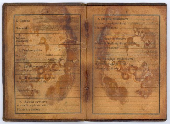 [nieczytelne – ślady po fotografii] Rysopis: / Wzrost 170 / Włosy brun. / Brwi szat. / Oczy c. nieb. / Nos sz. wkl[…] / Usta średnie / Broda wy[…] / Twarz owalna / […] / (podpis właściciela książeczki) EMutke