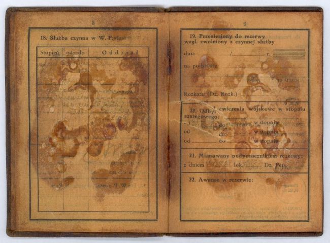 8. Stopień wojskowy w chwili wydania książ. ppor. / 9. Korpus osobowy: w chwili wydania książ. piech. [dalsze wpisy nieczytelne]
