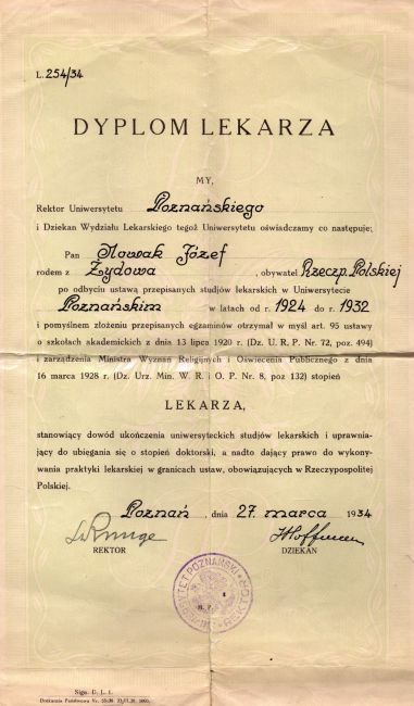 Izba Lekarska Poznańsko-Pomorska potwierdza, iż Józef Nowak został zarejestrowany z dniem 4.4.1935r. i ma prawo wykonywania praktyki lekarskiej w Państwie Polskim.